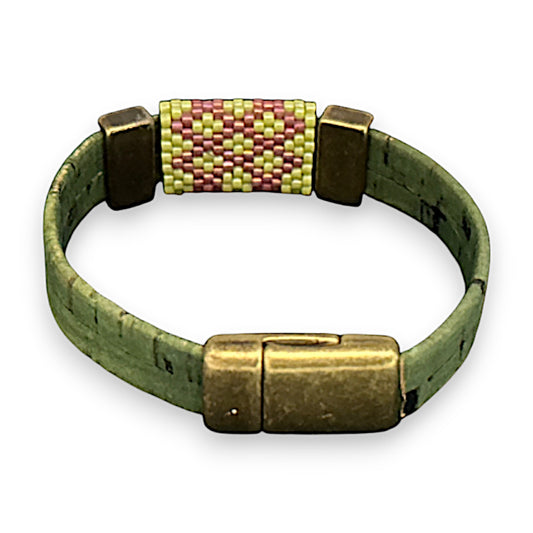 Green Eco-Friendly Cork Bracelet with Handwoven Peyote Bead Design
