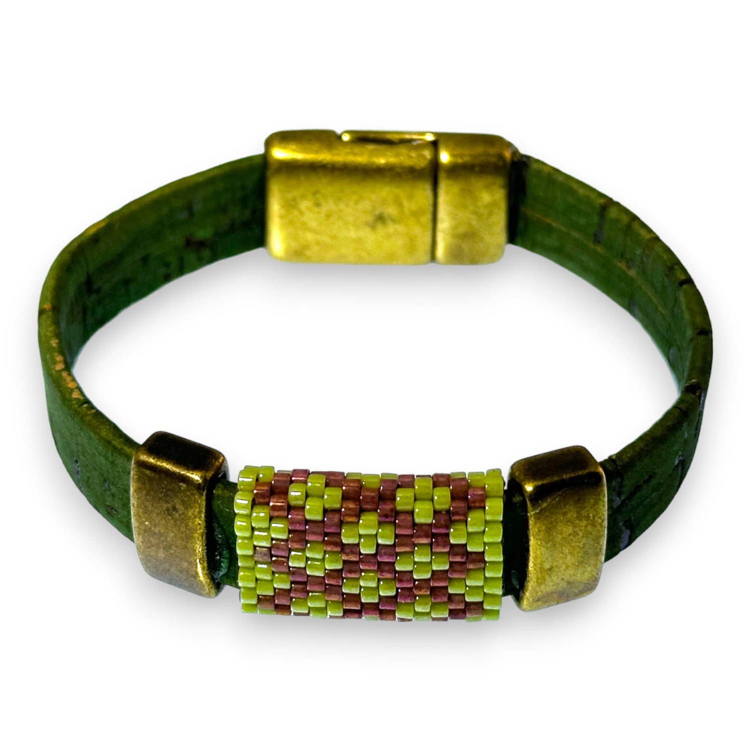 Green Eco-Friendly Cork Bracelet with Handwoven Peyote Bead Design