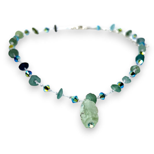 Hand Knotted Necklace with Roman Glass and Austrian Crystals