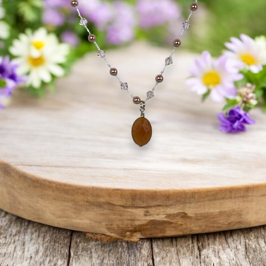 Hand Knotted Necklace with Druzy Stone, Brown Crystals and Tiger Eye Gemstones