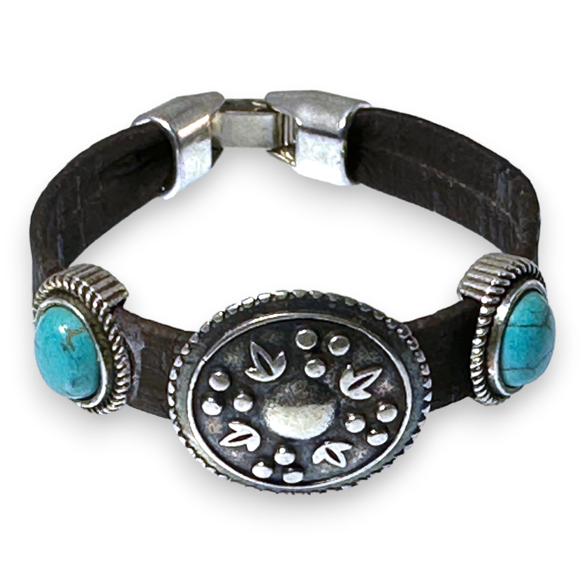 This cork bracelet is crafted with antique silver western inspired metal focal and turquoise sliders, combining style and durability. Made from sustainable materials, it is eco-friendly and hypoallergenic, perfect for those with sensitive skin.