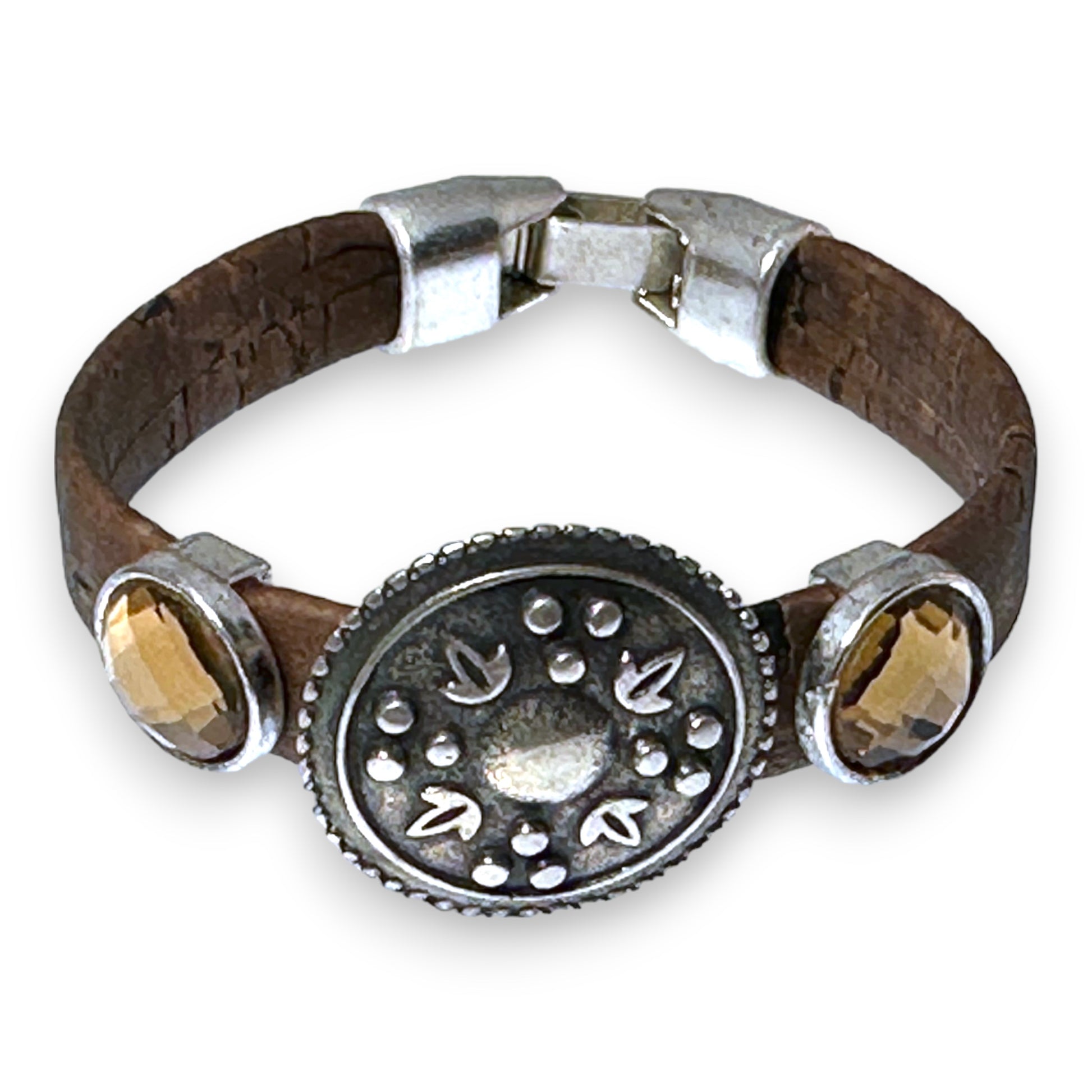 This cork bracelet is crafted with antique silver western inspired metal focal and sliders with brown crystal sliders, combining style and durability. Made from sustainable materials, it is eco-friendly and hypoallergenic, perfect for those with sensitive skin.
