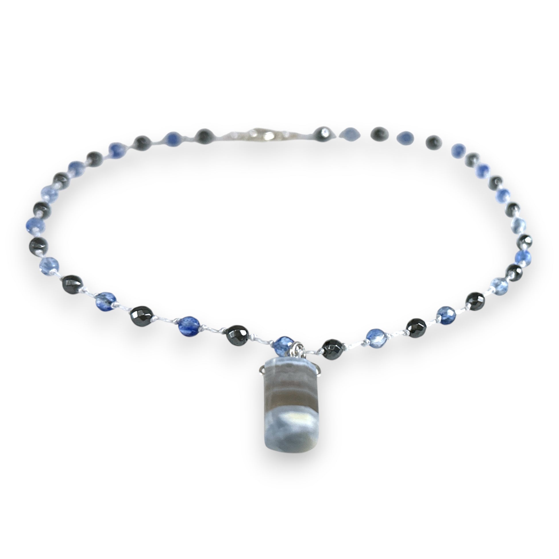 Hand Knotted Necklace with Blue Banded Agate, Blueberry Quartz and Hematite Stones