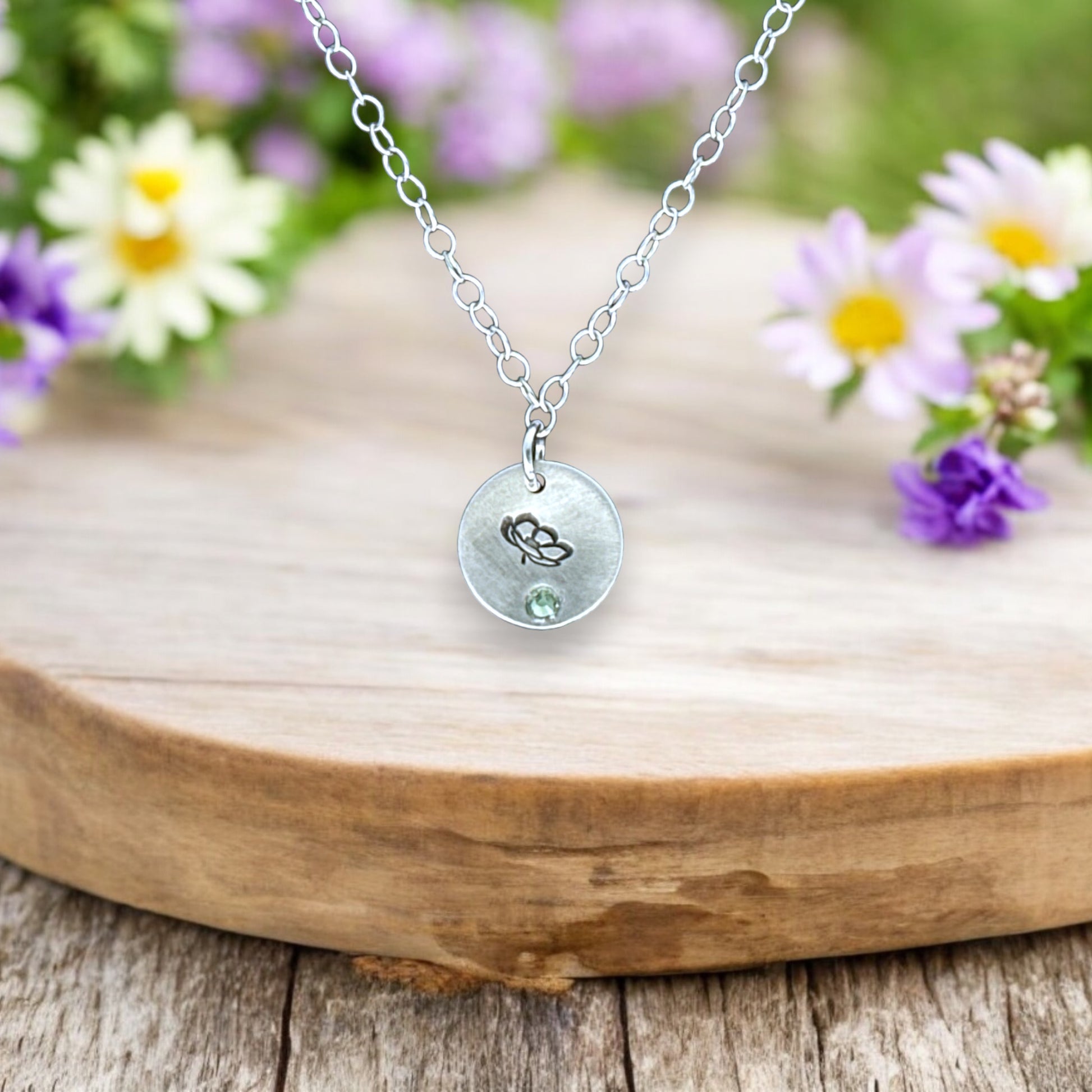 Celebrate the beauty of individuality with this exquisite hand-stamped birthstone flower necklace, adorned with a sparkling birthstone crystal.
