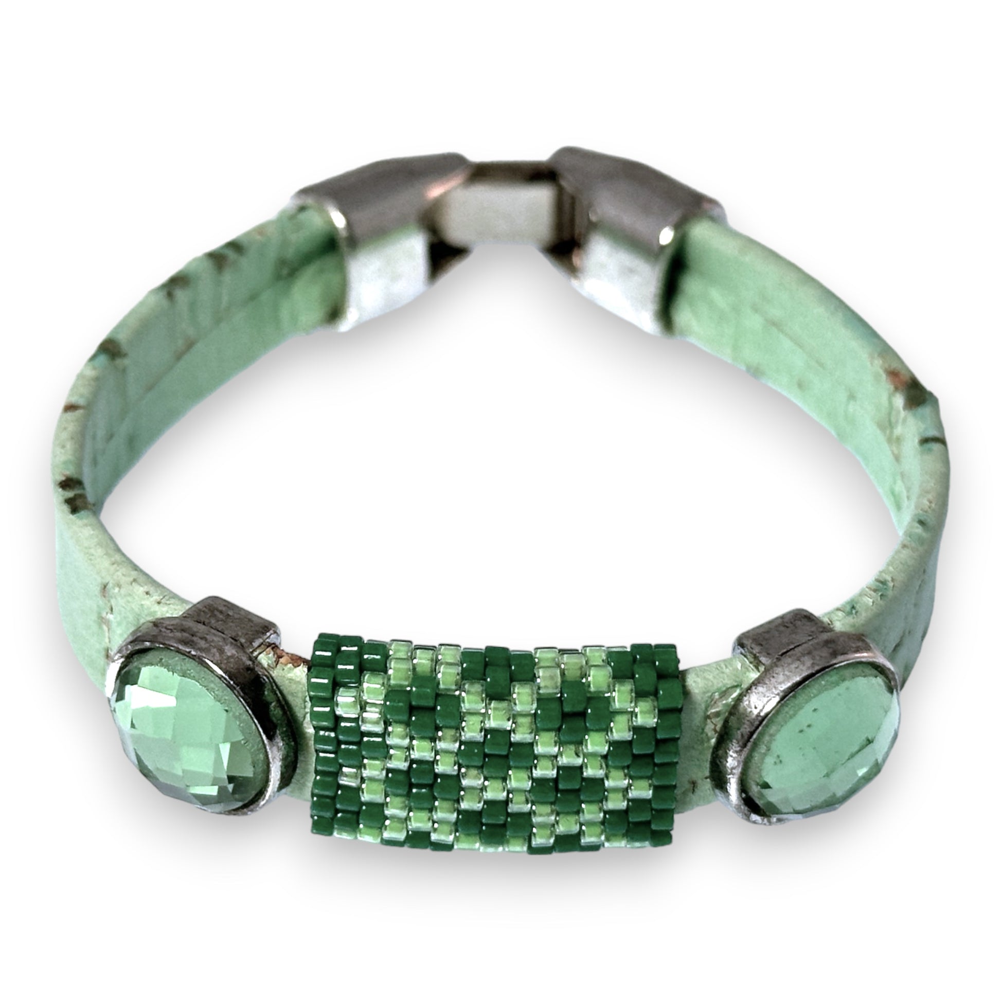 Mint Green Eco-Friendly Cork Bracelet with Handwoven Peyote Bead Design