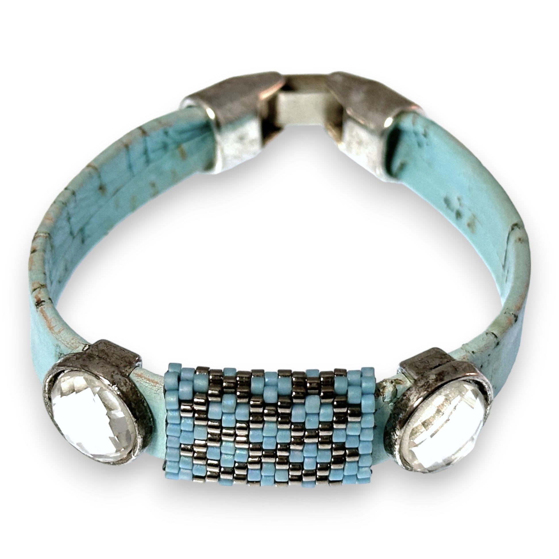 Sky Blue Eco-Friendly Cork Bracelet with Handwoven Peyote Bead Design