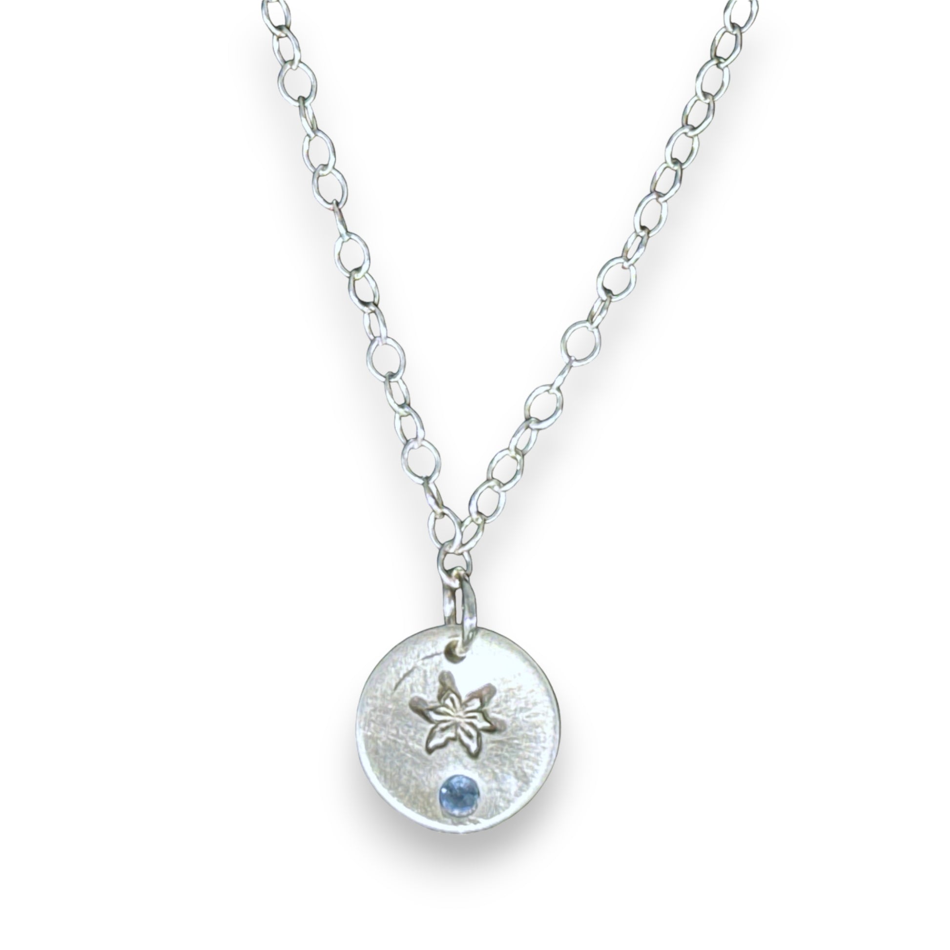 The pendant is a 3/8" sterling silver disc hung on a 16" sterling silver chain. It sparkles with a blue zircon swarovski birthstone crystal.